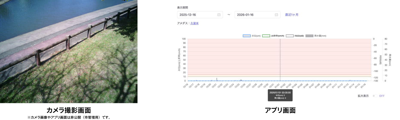 公園内の照明灯に設置されたカメラ・通信ユニット・水位センサーは、水位の変化を検知するだけでなく、周囲の状況を画像で捉えることが可能です。「数値情報」に「視覚情報」を加えることで、水の広がり方や現場の状況をリアルタイムに把握できる点が、本システム独自の強みとなっています。