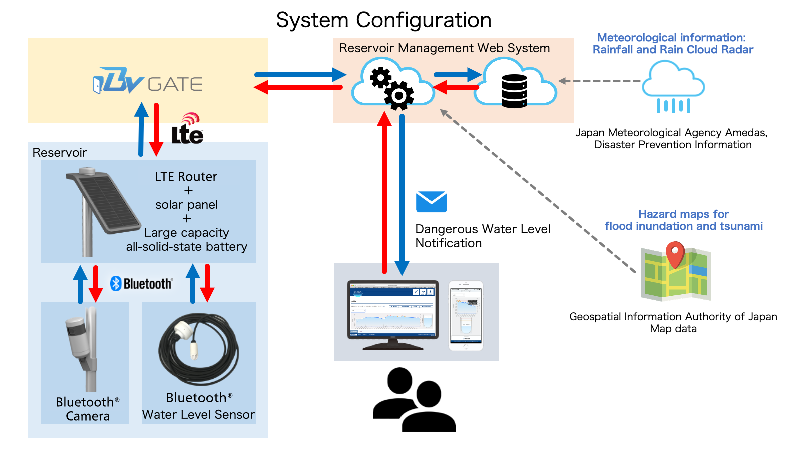 Heavy rainfalls in northern Kyushu and western Japan caused many reservoirs to break down, leaving catastrophic damages. Concerning such disasters occurring more frequently in recent years, national government has reviewed the criteria for selecting reservoirs for disaster prevention, changing the way of prevention significantly. There is an urgent need for each local government to develop a monitoring system, including the installation of a water level gauge, and a "Reservoir Management System" for easy and economical installation in many reservoirs.