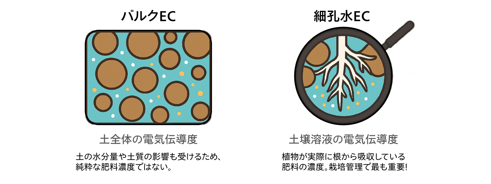 土の粒の隙間にある水(植物が根から吸収する水)に含まれるイオン濃度。「今、植物が吸っている肥料の濃さはどれくらいか」を示す、栽培管理において最も重要な指標です。